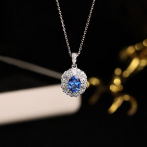 At the heart of this necklace glows a cobalt spinel, encircled by simulated diamonds—like stars gathered around a secret sun.