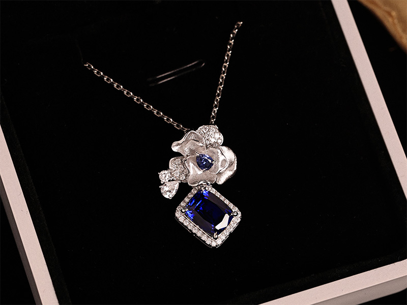 The camellia symbolizes ideal love and pure beauty, while the sapphire stands for loyalty.