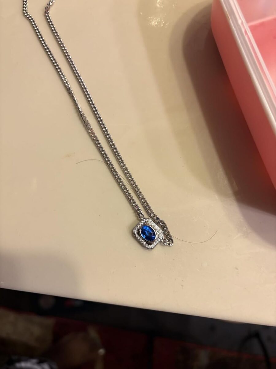 This is a gorgeous necklace. The blue stone is really eye catching. The Moissanite halo gives lots of sparkle. Chain is substantial and doesn’t look cheap. I have a different necklace that I use more for everyday wear (it’s a finer/lighter chain) but this one really is a show-stopper for date nights or events.