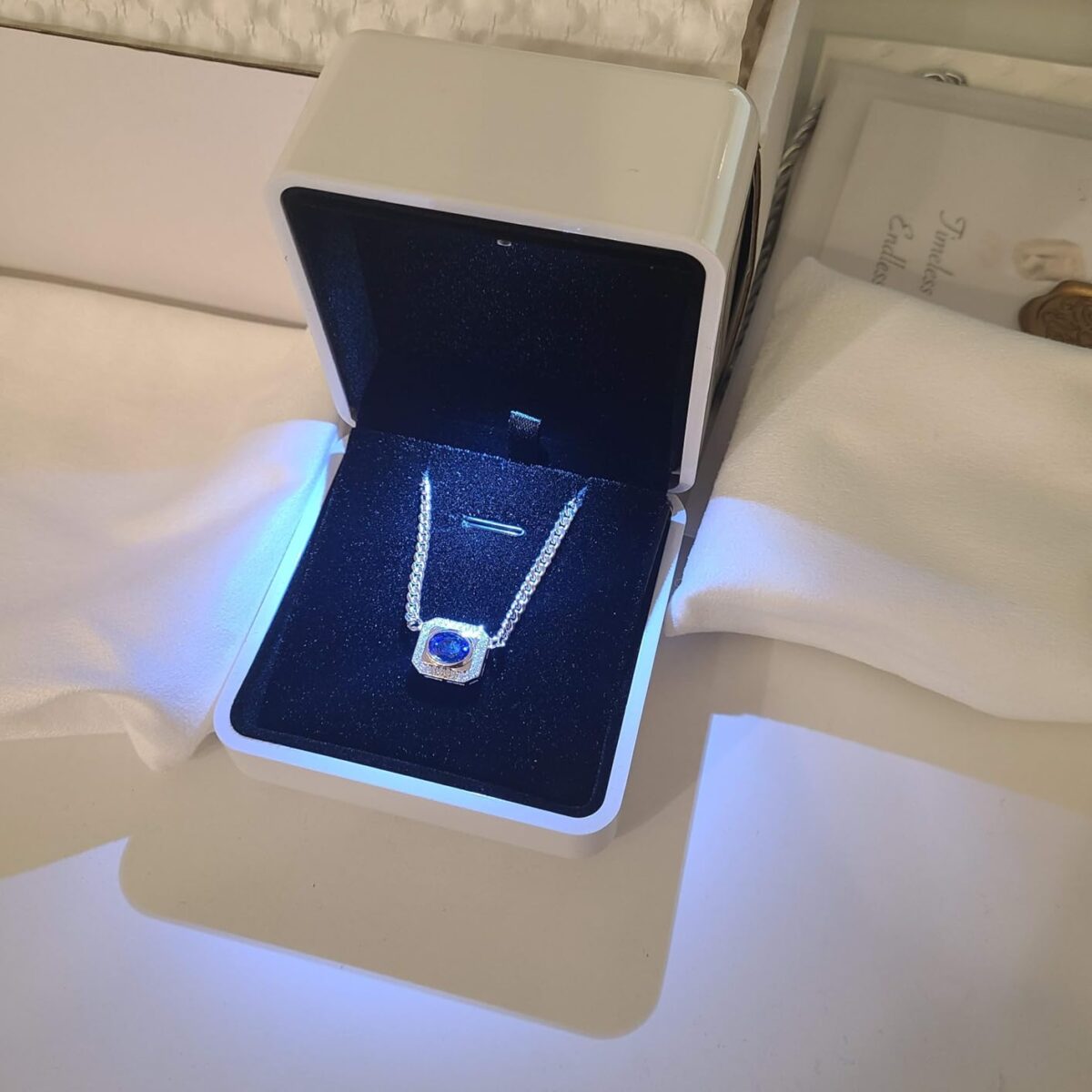 This necklace from Stilovero is absolutely stunning. The moment we opened the white gift box with the built-in light the deep cobalt blue stone lit up beautifully. It is bold rich in color and full of elegance. The halo of sparkling stones adds just the right amount of glam without being too flashy and the Cuban link chain gives it a solid luxurious feel. My wife has many different pieces from Stilovero very well made beautiful and great quality and this one definitely lives up to the same standard. It feels durable not like cheap gold plated jewelry that fades quickly. The adjustable length is perfect and the overall craftsmanship really stands out. It also came with a gemstone certificate care guide and polishing cloth which made the whole gift feel complete and thoughtful. This is the kind of piece that makes you feel special the moment you put it on whether it is for a celebration or just because you want to treat yourself or someone you love. Highly recommend.