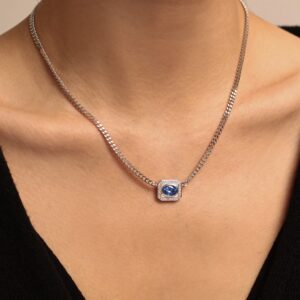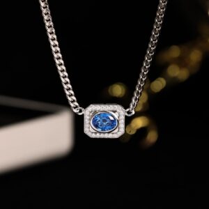 This StiloVero necklace has a 1.7 ct cobalt spinel gem that is lab grown and is adorned by 26 small Moissanite diamond stones; it’s really lovely. The hue of the cobalt spinel is an ocean blue; it has some sparkle and radiance to it, as do the small Moissanite diamonds surrounding it. The chain is a 18k white gold-plated .925 sterling silver, and Cuban link style that looks bold and complements the necklace beautifully, it has an elegance to it. The chain length is also adjustable.
