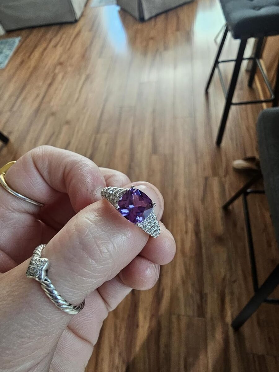 This is my favorite ring. I absolutely love it! The design is amazing with its diamond staircase leading up to the big stone. It’s unique and gorgeous! It does change color in different lighting too! Mine goes from purple/red to a purple/blueish gray in outdoor light. Its stunning. I wear it almost everyday. The sizing seems a bit off but not bad. I’m a size 10 usually and this size 10 was a bit snug but I can still get it on and off with a little struggle. All in all it’s definitely worth it!