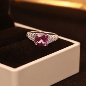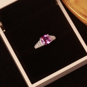 In soft indoor daylight, it shows a calm grey-violet hue—cool, quiet, and elegant. Step outside, and it transforms under sunlight into a romantic violet-red glow—like dusk unfolding into starlight. The band, layered with white moissanite, sparkles like a starry path to dreams.