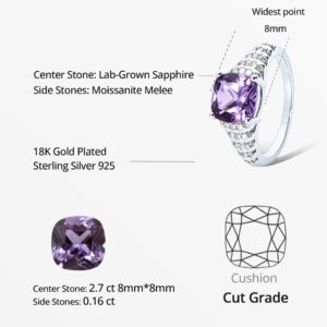 It is a rhodium-plated 925 sterling silver with a 2.7ct cushion-cut lab-grown sapphire (VVS1 clarity) and moissanite hal, and promises to shift from violet to bluish-purple under sunlight, all while staying tarnish-free thanks to its thick plating. After wearing it daily for a week now, here is what I feel about this ring: It has a cushion-cut sapphire, and the moissanite “halo” catches every ray like tiny diamonds; adding a lot of sparkle to it. Indoors under LED lights, it glows a soft, regal violet; step outside, it turns a vivid bluish-purplely color. The rhodium-plated silver band feels sleek and modern, and is thicker band than most rings. Size is true to size. It’s not dainty for sure. No tarnish, and it polishes up in seconds with the included cloth. The lab-grown sapphire is certified VVS1, naked eye can’t detect any inclusions¡ªand the color shift is legit. It is bluish, violet, purplish. Arrived in a velvet-lined gift box with a certificate, greeting card, and care manual¡ªfelt like a high-end boutique unboxing. It is lightweight for such a chunky stone; sits flush and doesn’t seem to turn on finger. Now, up close of the ring on your finger may be able to see it isn’t a very high priced piece, but from a distance it is very pretty, larger, and fun to wear.