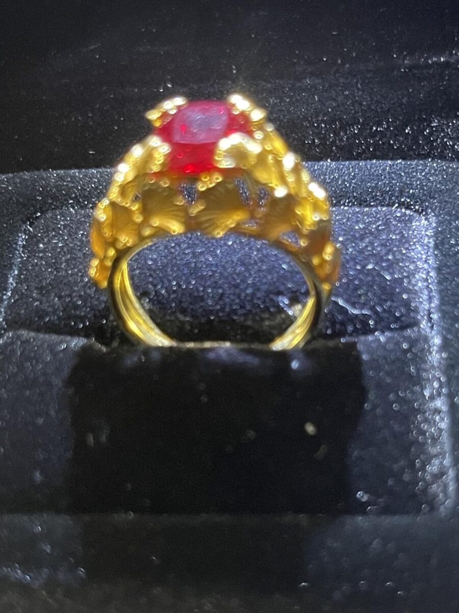 Gorgeous statement ring. Ruby is clear red color, not pinkish. Ginkyo leaft details are amazing. Gold is solid yellow color. No skin reactions so far. Gold plating is supposed to be thicker than on cheaper jewelry. I hope the plating will last at least a few years. It’s not solid gold, so will eventually tarnish but the price is so much cheaper than real gold jewelry. Love it! Only downside is it will need to be babied more than real gold and ruby, since the ruby will be slightly weaker and gold plating will wear off eventually.